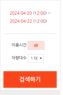 ① 홈페이지 방문하여 렌터카 메뉴를 클릭하고 이용희망날짜를 설정하고 검색하기를 클릭합니다.